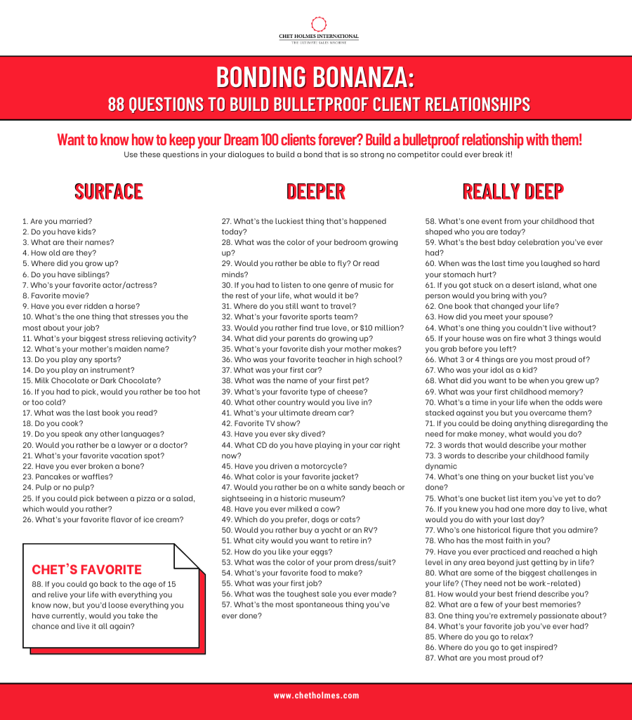 Here’s a tip: if you want to keep your Dream 100’s forever, you must build a bulletproof relationship with them! To help you get started, we compiled 88 questions that you can use in your dialogues to build a bond that is so strong no competitor could ever break it!